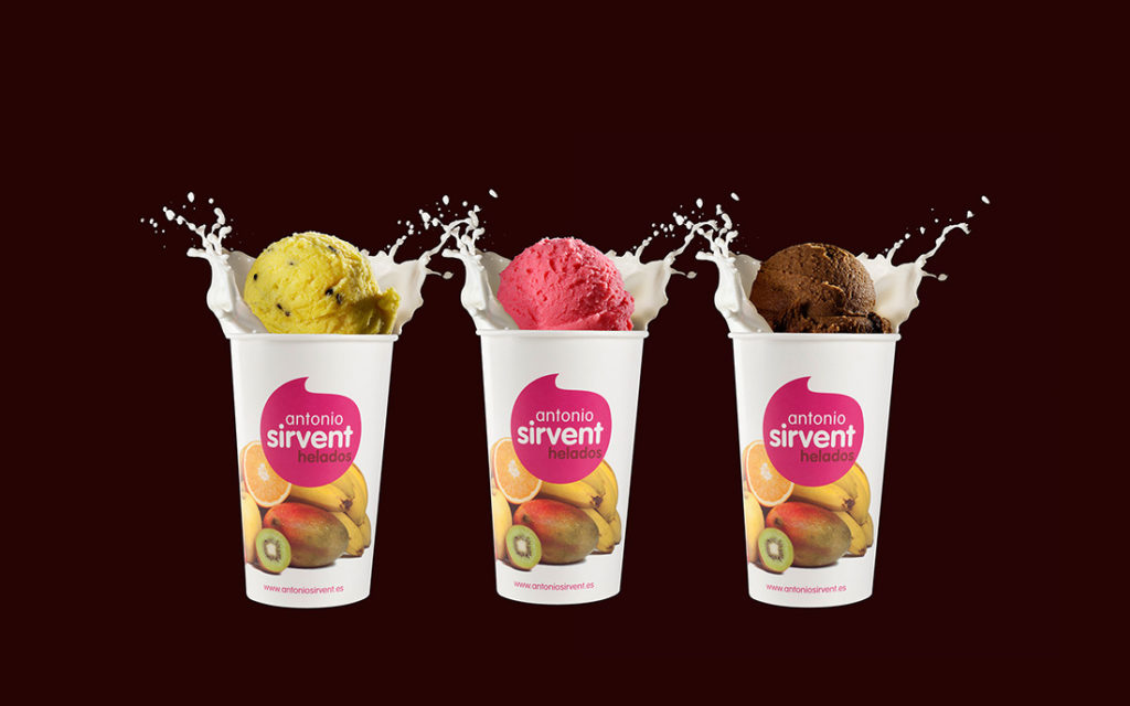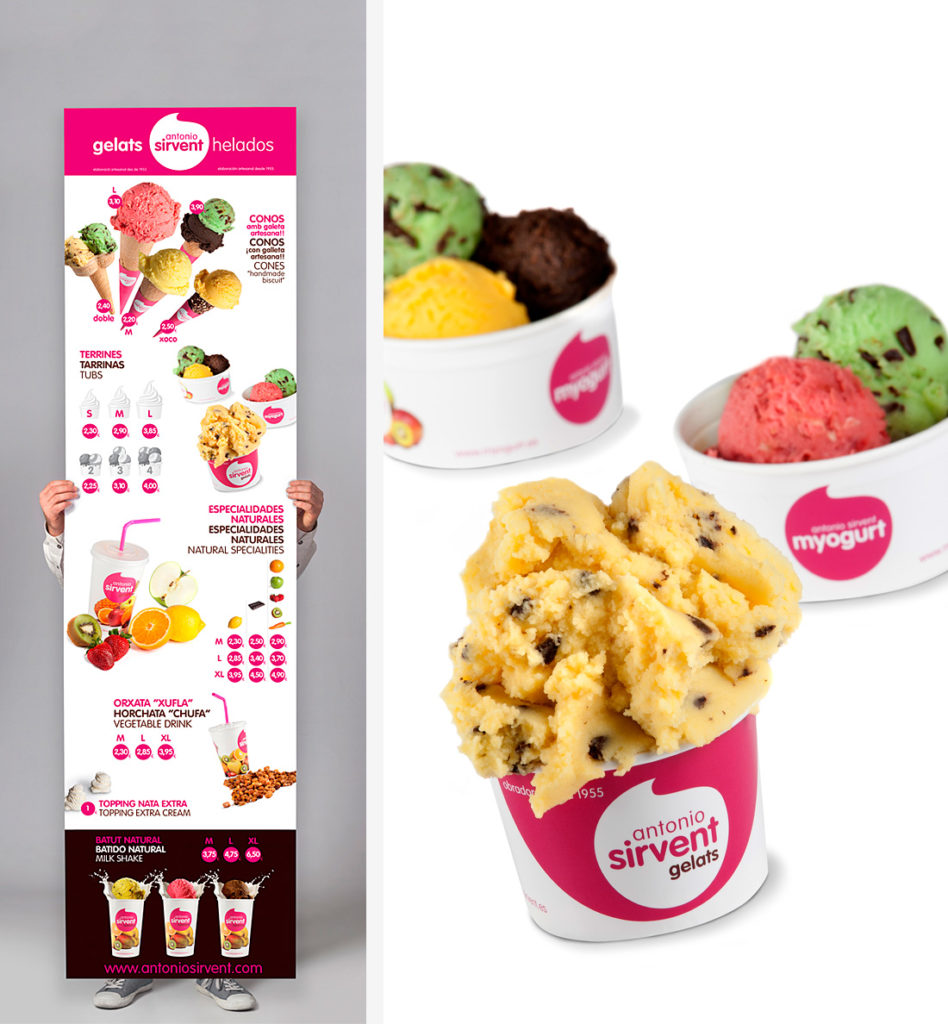 El heladero artesano de prestigio, Antonio Sirvent, decide hacer un cambio de imagen hacia una línea actual. Se crea una imagen que hace de paraguas a las diferentes líneas de negocio, con identidad propia para adaptarse a nuevos productos. Se crea una imagen fresca y moderna para los elementos de packaging, de promoción, comunicación gráfica, etc.
