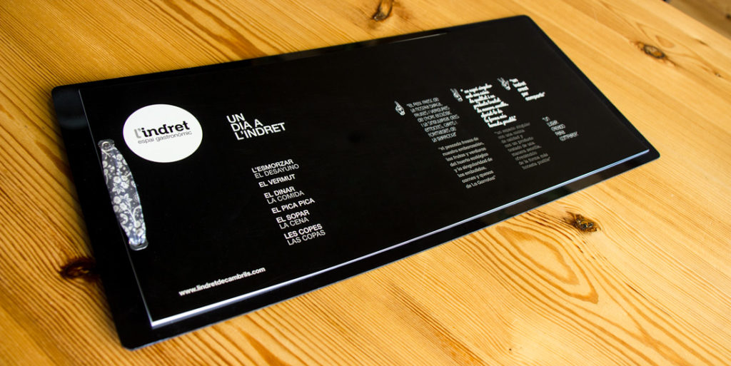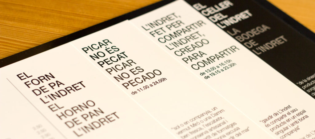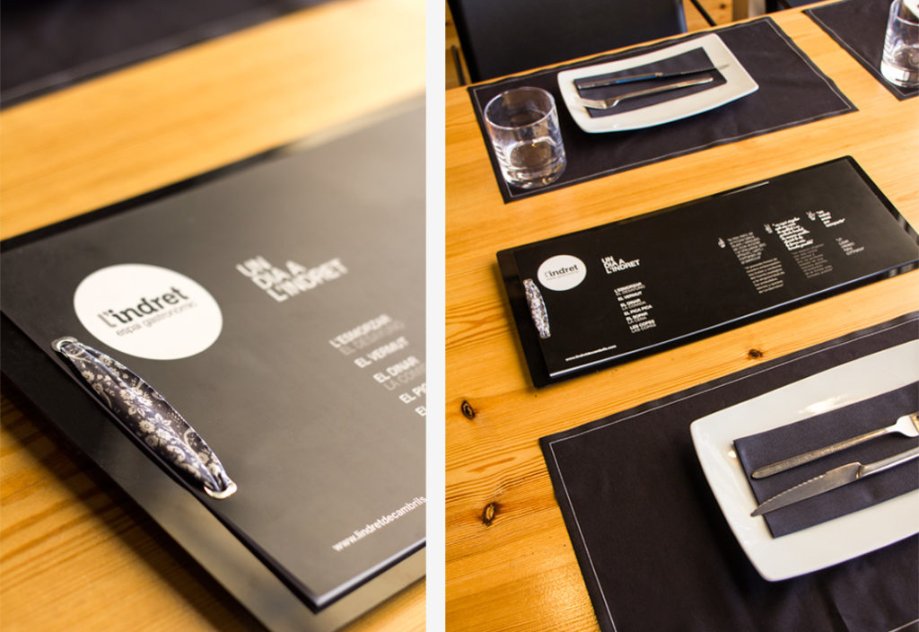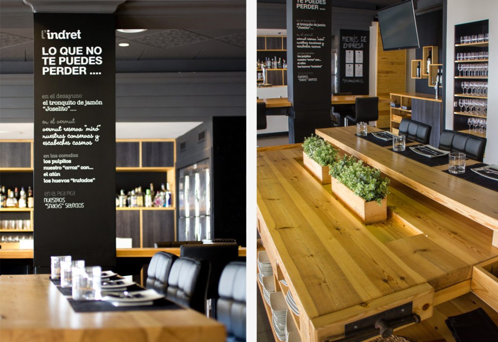 “Global Desing” en su máxima expresión para el restaurante l’Indret. Diseño de logotipo, imagen gráfica, cartas de restaurante, fotografía de producto, decoración e interiorismo, diseño del mobiliario y gestión del proyecto. L’Indret es un proyecto gastronómico, con un concepto innovador, con producto de alta calidad, honesto y en un espacio singular, creado para compartir. Discreto y austero, pero con personalidad propia. Dos materiales: la madera y el hierro color negro, forman los cimientos que conviven con la variedad de estilos en la iluminación. En el interior, la cocina se plantea como un amplio espacio de trabajo, visible para el cliente desde el interior del restaurante, muestra de la transparencia. Las siete líneas de producto, se representan en su interior con un mural que se extiende a lo largo de la misma.