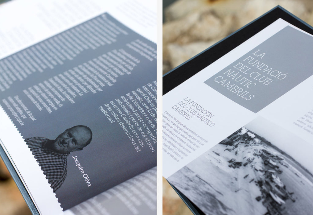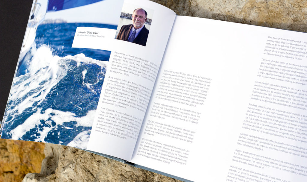 Diseño y maquetación del libro conmemorativo de los 50 años de vida del Club Nàutic de Cambrils. Esta edición se realiza en dos idiomas catalán y castellano. El reto y la complejidad de este proyecto se basa, en crear un libro con una maquetación dinámica, en el cual los dos idiomas están al mismo nivel pudiendo realizar la lectura de estos simultáneamente. Se ha estructurado la información en tres grandes bloques: recorrido histórico en paralelo a la evolución de la ciudad, barcos emblemáticos y álbum fotográfico.
