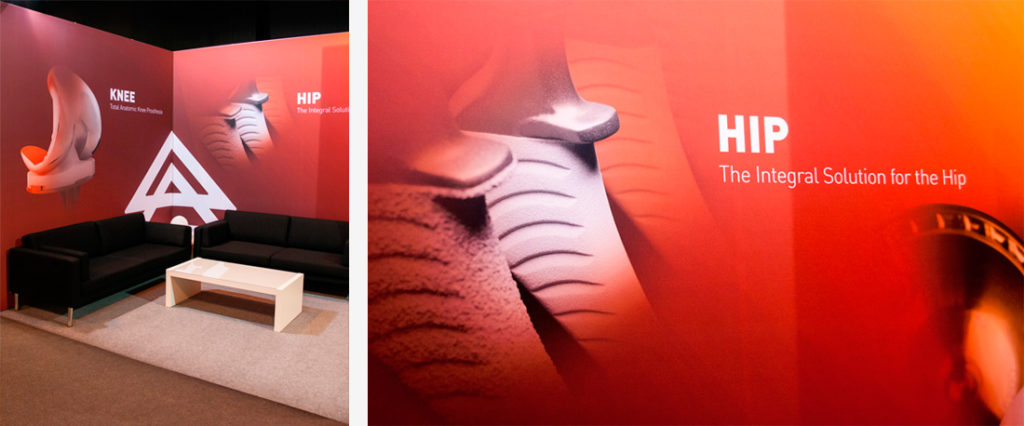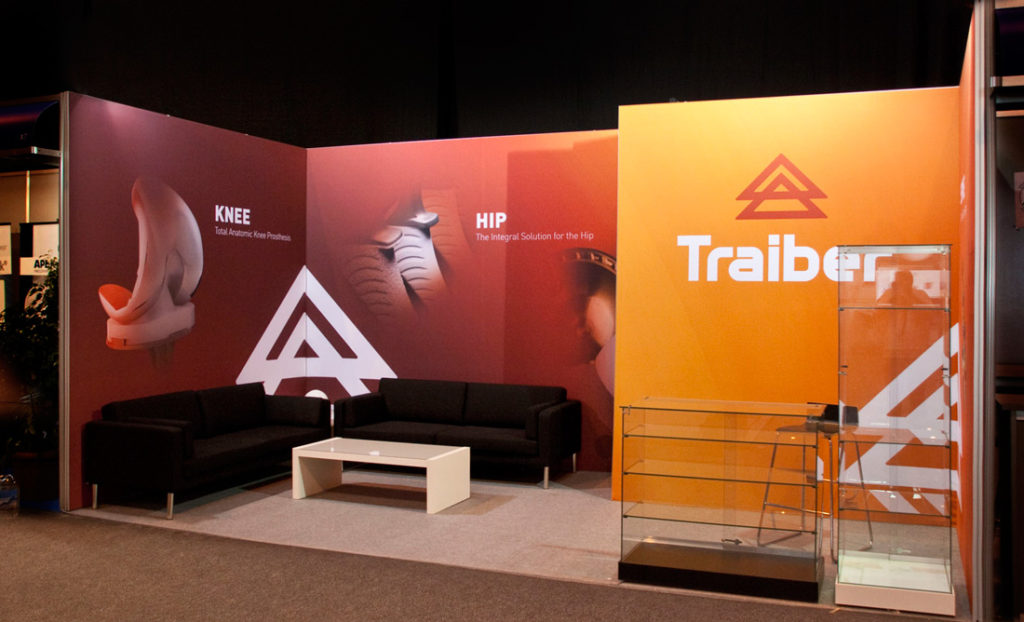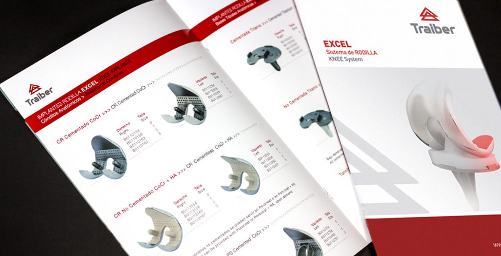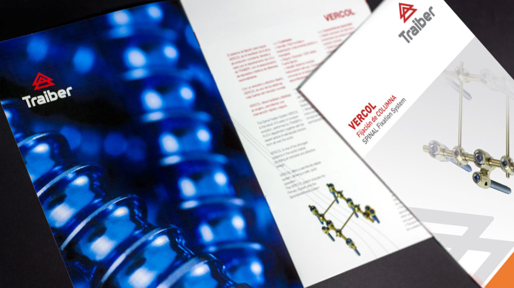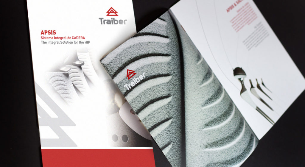 Traiber es una empresa de fabricación de prótesis de rodilla y columna vertebral. Para la imagen gráfica, se realiza un rediseño del logotipo, actualizando el icono, un elemento representativo de la empresa. Se crea una línea gráfica para los catálogos de producto. Realización y montaje de stand reutilizable.
